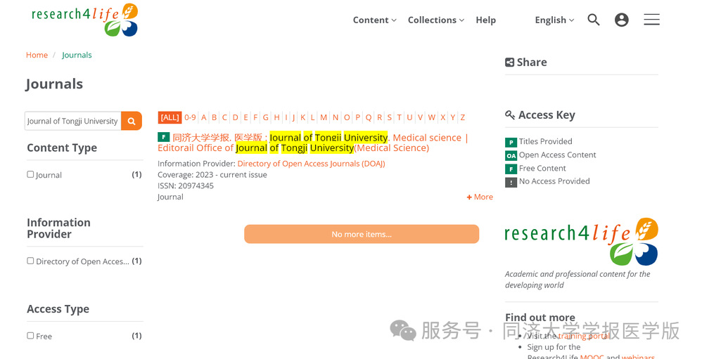 2025年11月,《同济大学学报(医学版)》正式被国际知名数据库Research4Life-HINARI收录。此次成功收录,是对《同济大学学报(医学版)》学术质量和影响力的高度认可,对继续提升期刊国际影响力、扩大传播范围等方面均具有积极意义及重要推动作用。